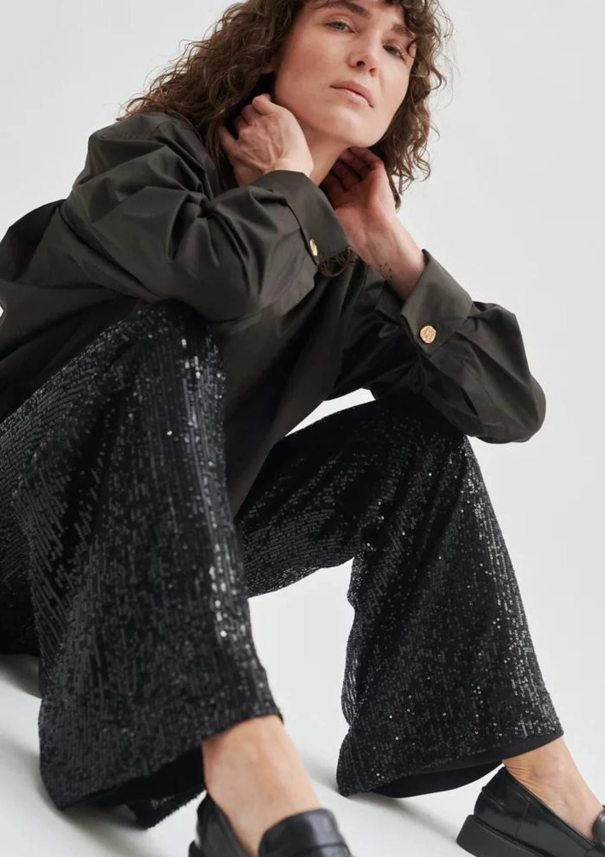 Second Female sequin trousers. Made with all-over tiny round sequins on semi sheer mesh. Featuring an elasticated waistband and decorative pockets at the back. Fully lined. Mid waist with slightly flared, swingy leg. Pair with your favourite winter textured knit, a tee and blazer or an oversized shirt.