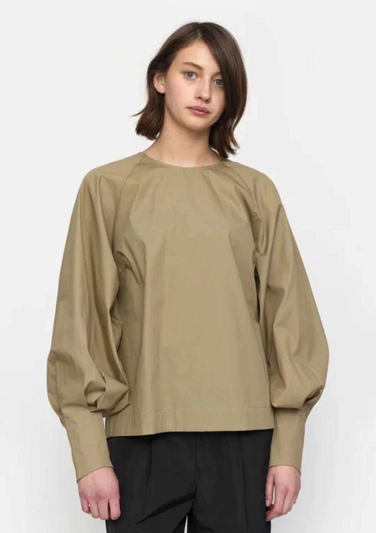 This O-neck blouse features voluminous raglan sleeves with pleated cuffs and a stylish slit at the back, complemented by logo embroidery at the side for a chic and elegant look. Semi tuck into your denim for an easy effortless elevated style.