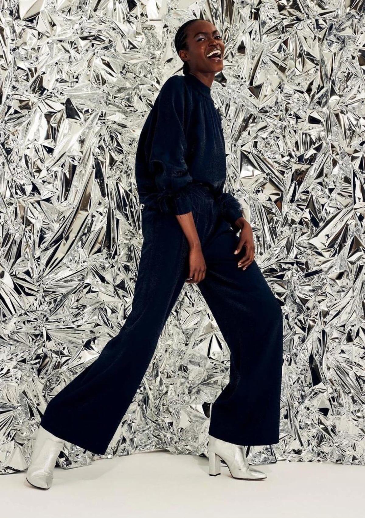 Feeling festive? This dark blue blouse for women is designed for all your special occasions. A shiny fabric and voluminous sleeves finished with removable feathers are your perfect match. Wear it with a stylish skirt or dress down a touch with denim.