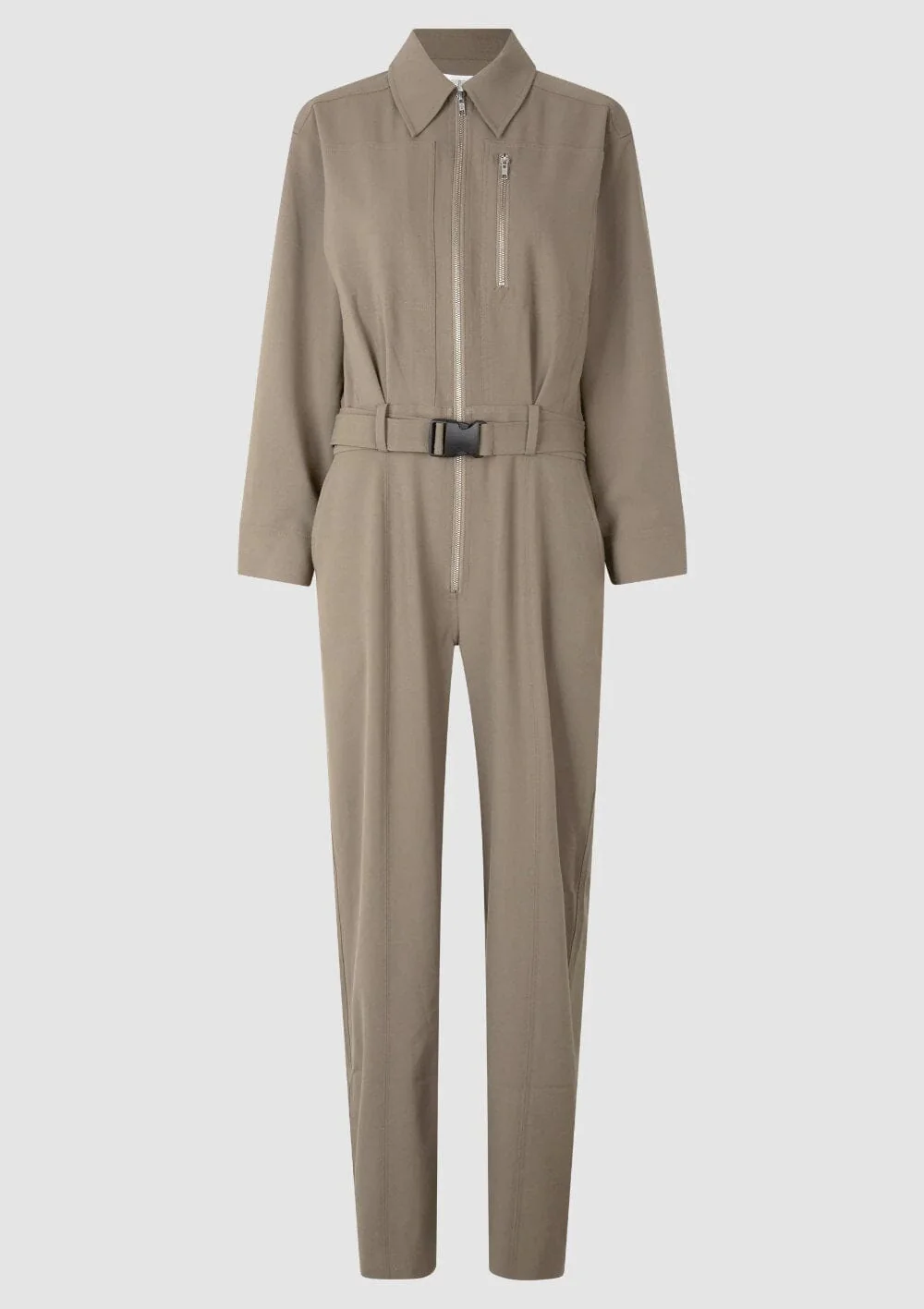 Second Female zip-up jumpsuit. Made in a soft and light fabric with a drapy quality. Featuring an oversize collar and zip fastening at the front. One open chest pocket with side opening and one chest pocket with zip closure. Two slanted pockets at the front and two decorative welt pockets at the back. Belt loops at waist with plastic clip buckle. Long sleeves with button fastening at cuffs. Regular fit at the top with wide, fluid legs.