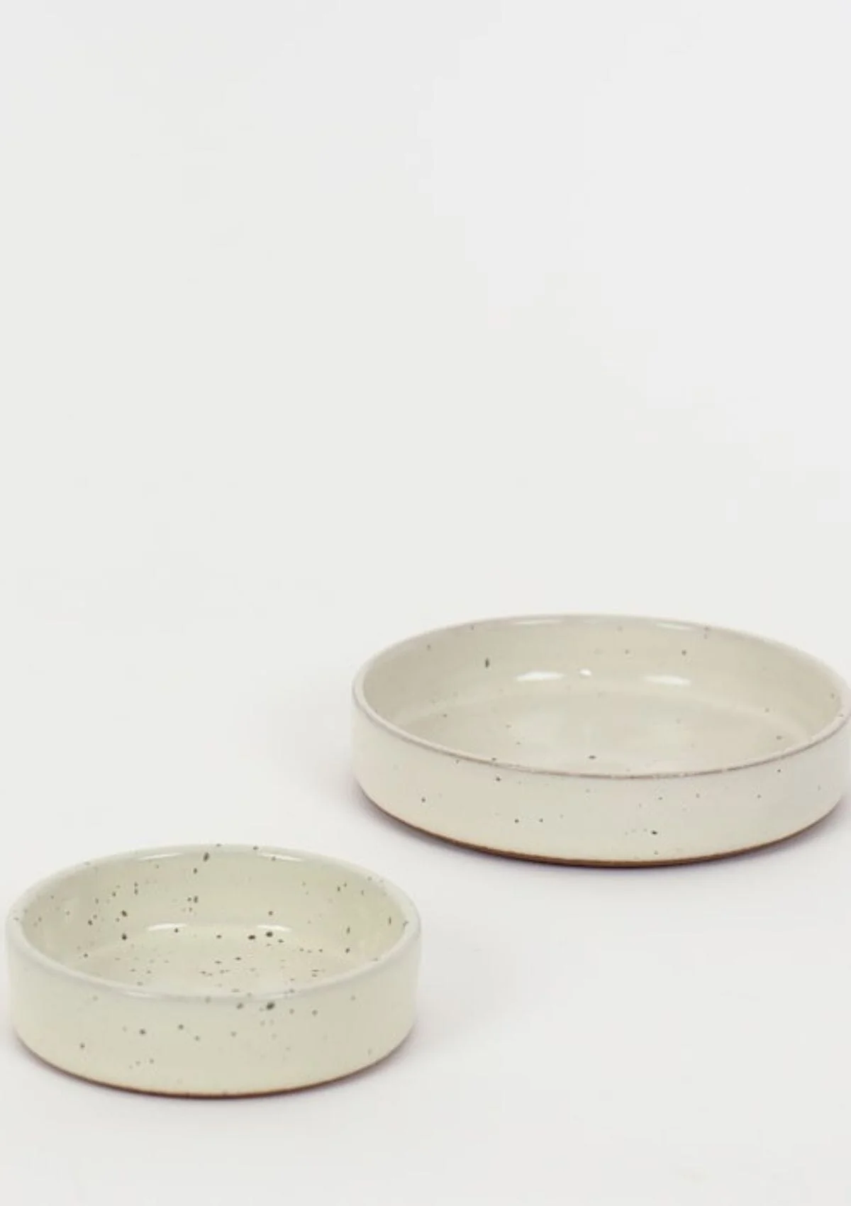 The hand thrown dish has an off-white glossy glaze with small black irregular spots. The dish is dishwasher safe.