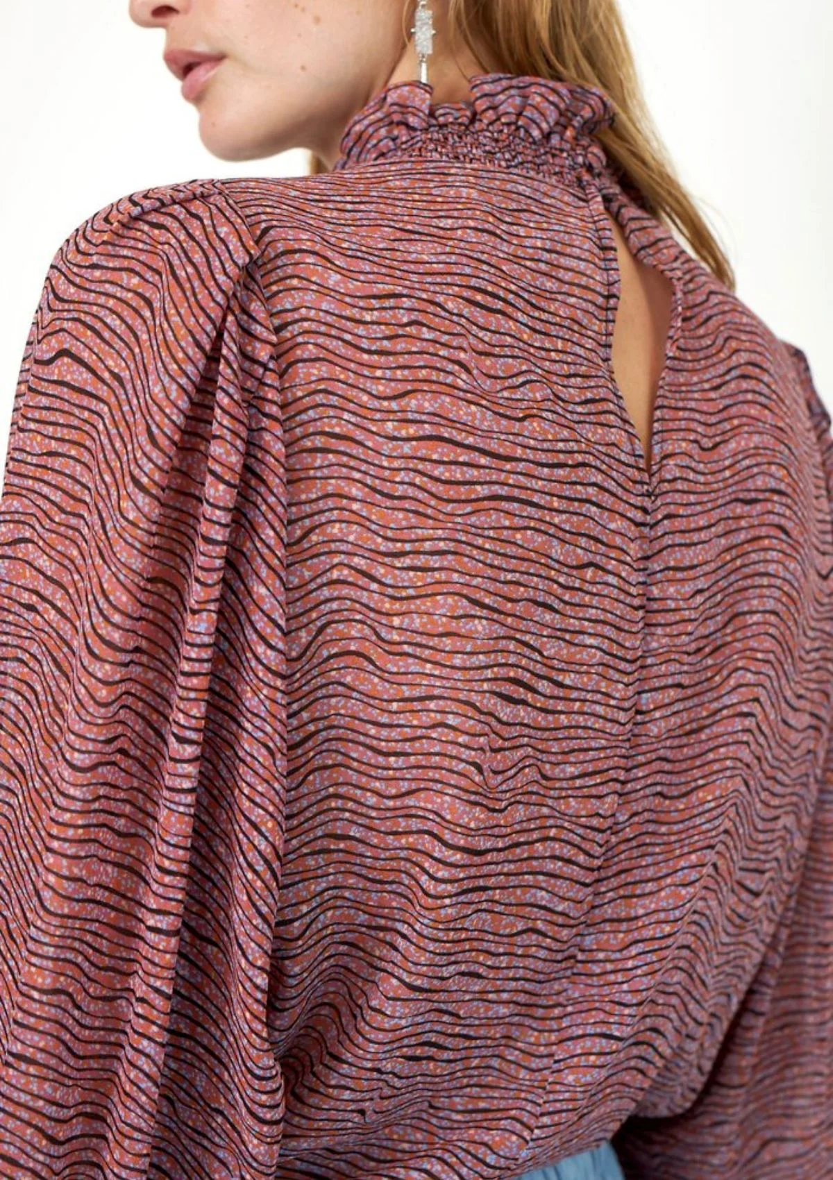 This printed blouse is made in a luxurious, 100% recycled polyester quality. The blouse has classic collar stand with frill detail and deep V-neckline with button closure. It has voluminous raglan sleeves with elasticated cuffs. The blouse has loose fit. Pair with jeans and boots, or tuck in a high waisted trouser for a smarter look.